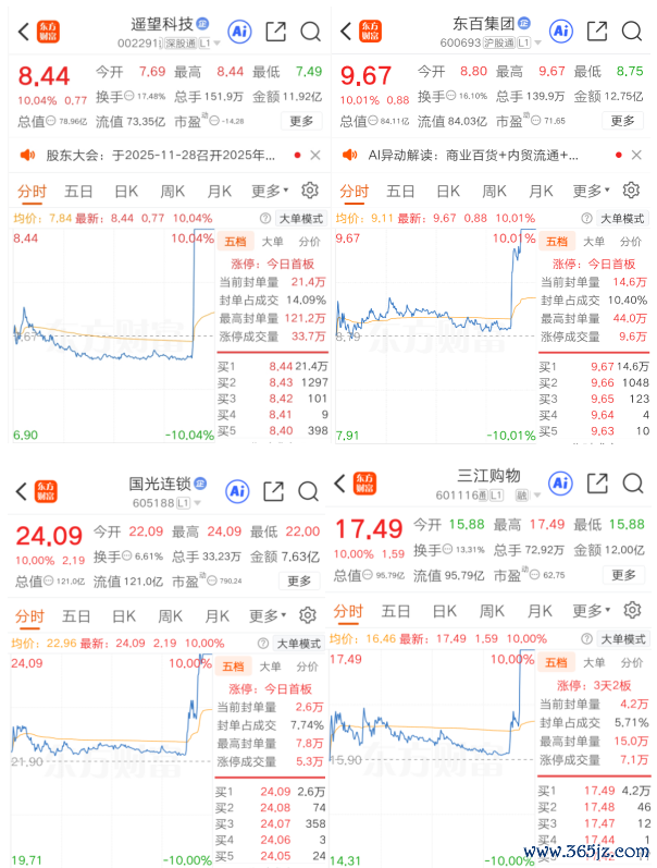 A股尾盘时分,大消费板块出现异动,遥望科技、东百集团、国光连锁、三江购物等多只个股直线拉升至涨停板,欢乐家也一度触及20%涨停。中百集团、步步高、中央商场等纷纷冲高。
